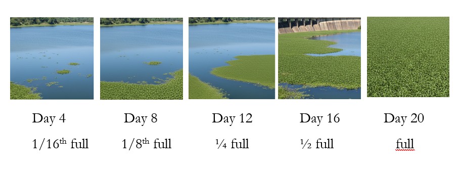 Let me give you a concrete example: There’s a dam near where I live that became infested with Kariba weed. On day one, there were just a few plants bobbing about. By day two, they were appearing in different places. By day 12, the dam was a quarter full of them. By day 16, it was half full. And by day 20? One hundred per cent of the dam was covered in floating weeds! The coverage doubled every four days.