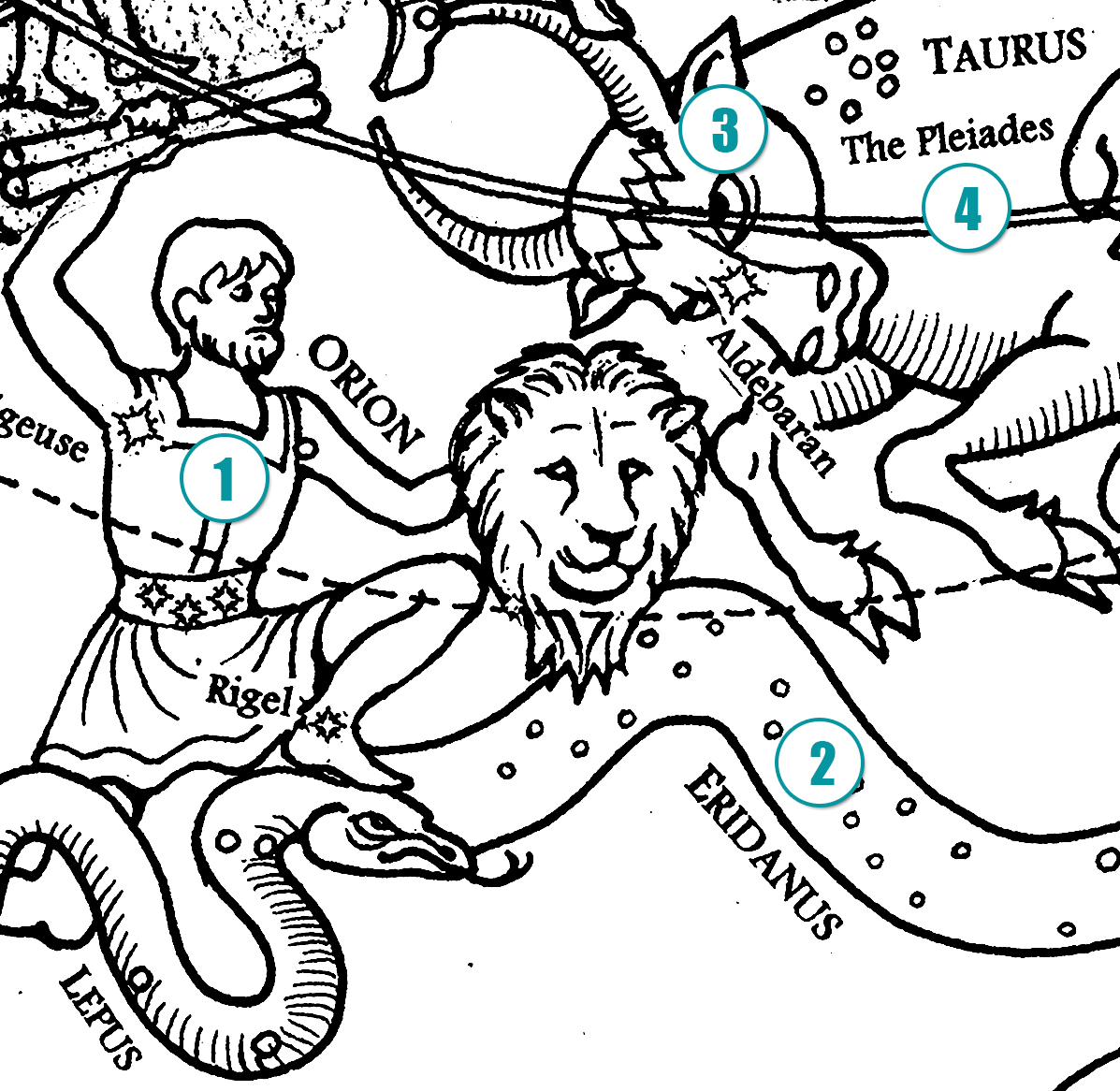 Now, to the particular mystery referenced in Revelation 10. I have already introduced and started to develop the idea that John was using the astronomy of his day as a device for writing what the Holy Spirit was inspiring him to record and the Seven Thunders is another example of this. One of the most well-known constellations is Orion (marked 1 in the image), pictured as holding a scroll in one hand, the head of a lion in the other, and his one foot is planted on the ‘sky river’ Eridanus (2). Just to his right and slightly above him is the constellation Taurus (3), the bull, which symbolises something very dark and sinister that I will explain when we get to Revelation chapter 13. In the shoulder of the constellation of Taurus is a group of seven stars (number 4 in the graphic) known as the Pleiades (Job 9:9). John apparently uses the constellation Orion to represent the mighty angel of Revelation 10 and the Pleiades to represent the message of the Seven Thunders, but this still does not shed any light on the message itself; it is a mystery. In fact, the angel then utters the words, “There will be no more delay! But in the days when the seventh angel is about to sound his trumpet, the mystery of God will be accomplished, just as he announced to his servants the prophets.” (Revelation 10:6-7).The Bible does indeed contain mysteries because it is genuinely God-breathed,so